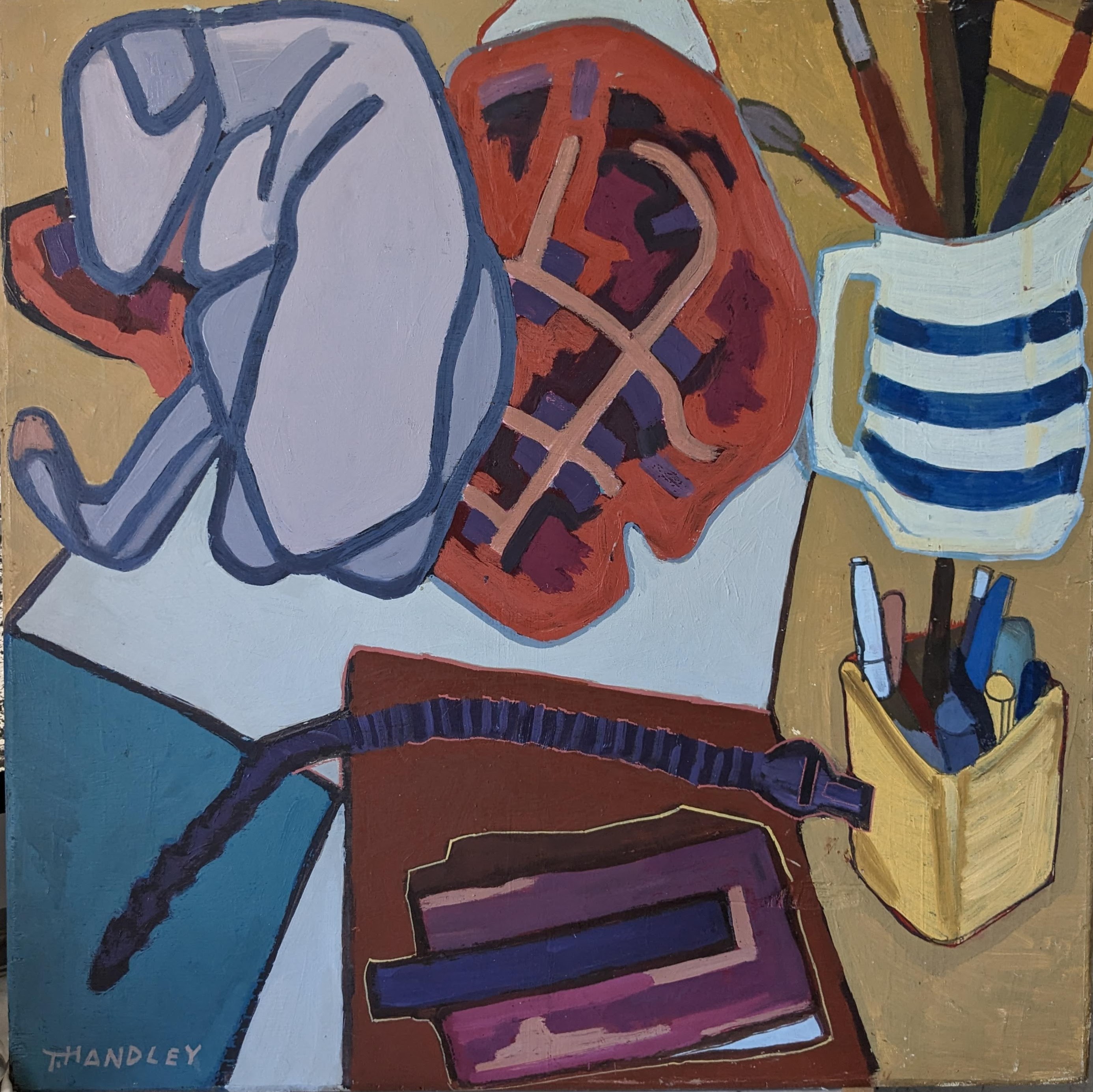 The fluffy terrier on her workbench blanket; books; pens; the bentness of things. Presence. Absence.