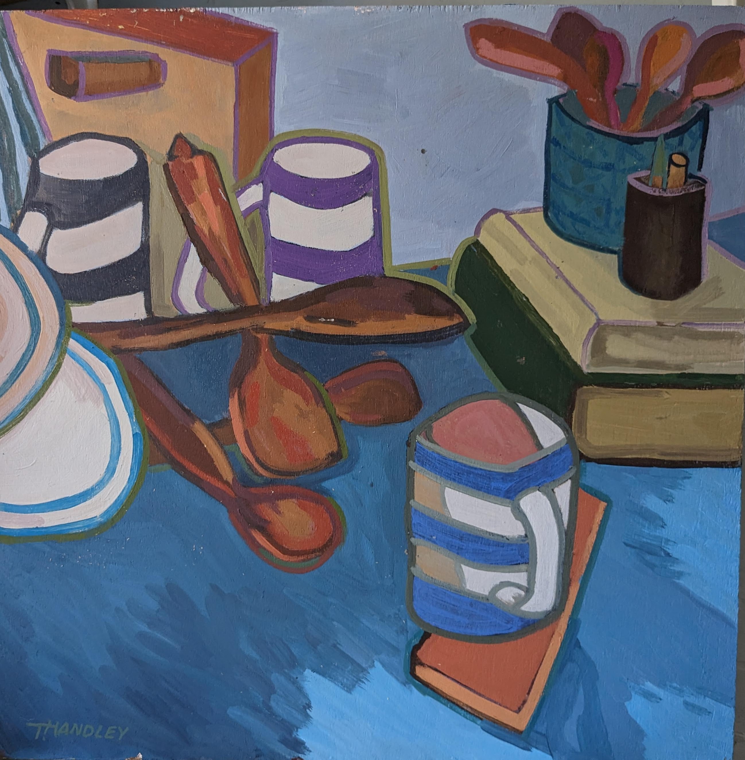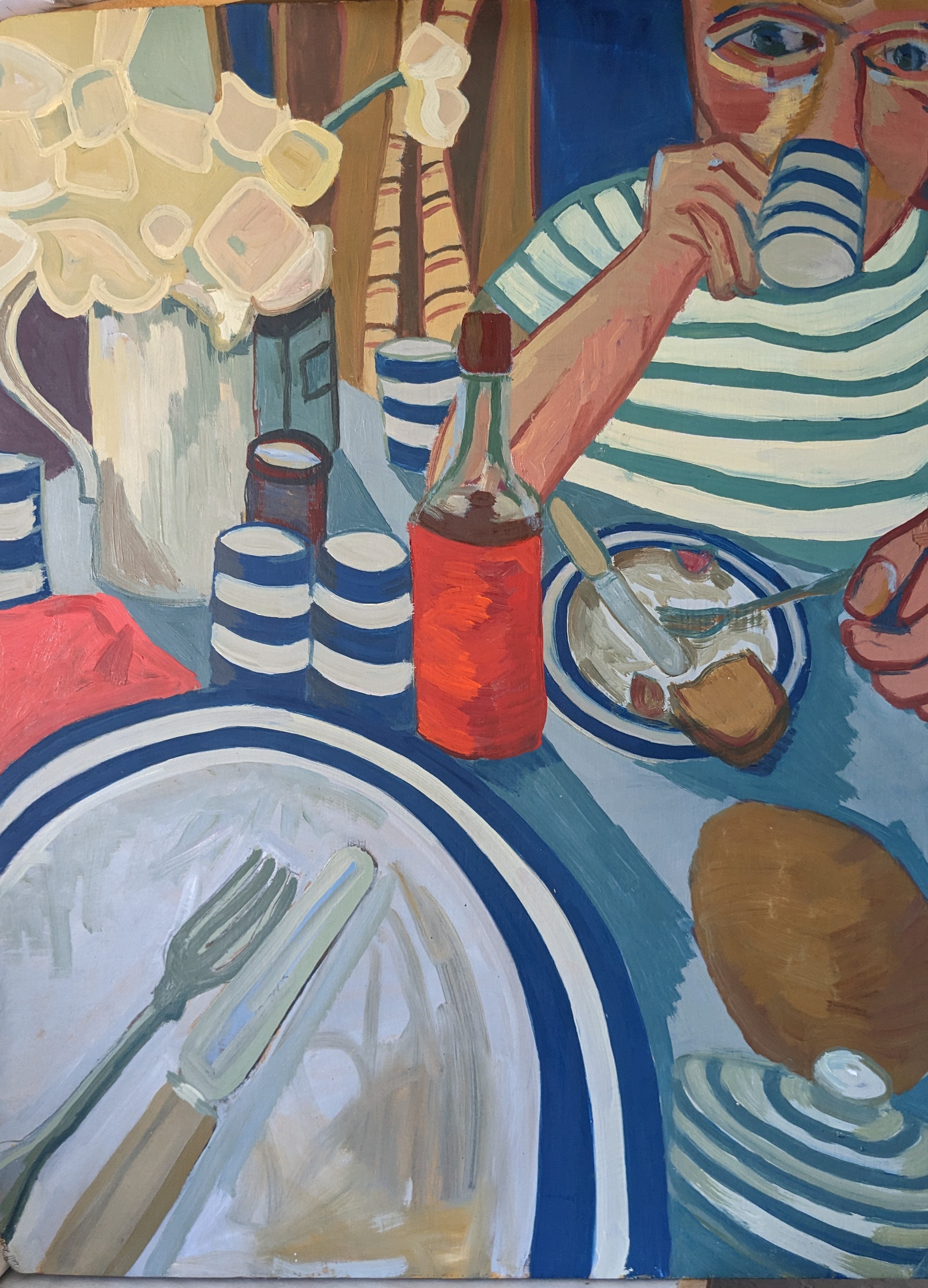 Where breakfast gets jammed against clean pots, cooking gear, books, that tea towel.